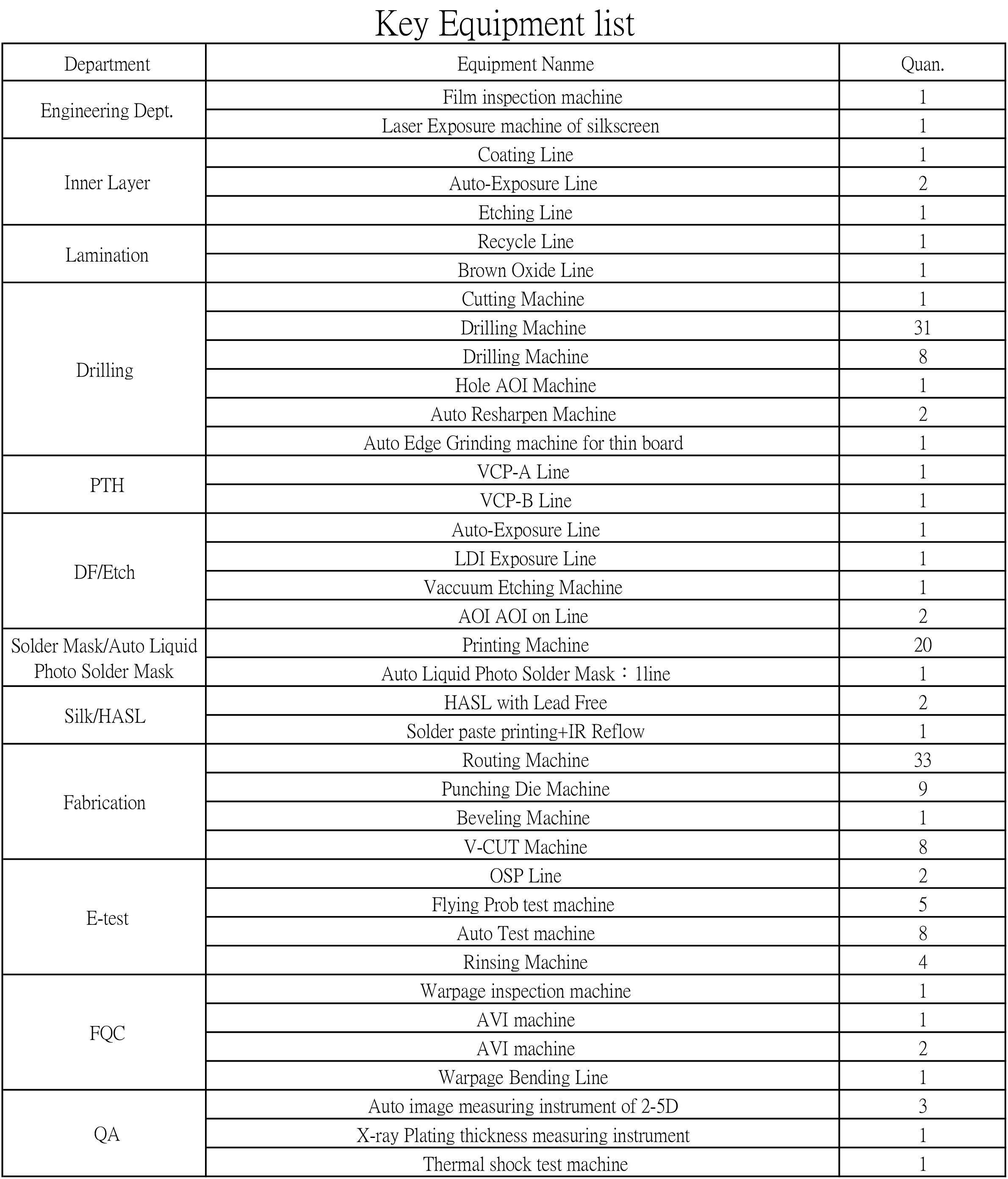 Key Equipment list